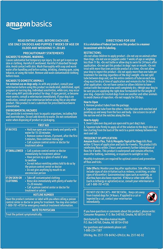 • One 6 dose pack of Amazon Basics Flea, Tick & Mosquito Topical for Medium Dogs (11-20 pounds)