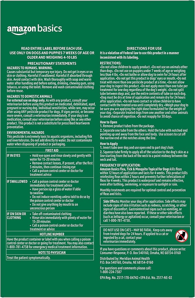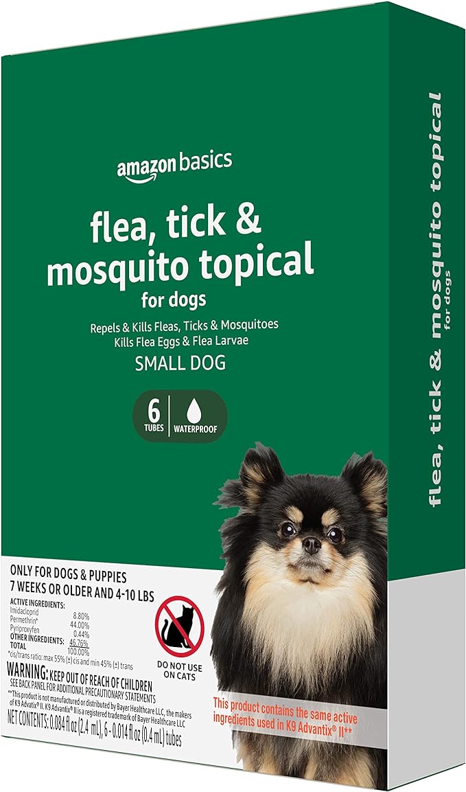 • One 6 dose pack of Amazon Basics Flea, Tick & Mosquito Topical for Small Dogs (4-10 pounds)