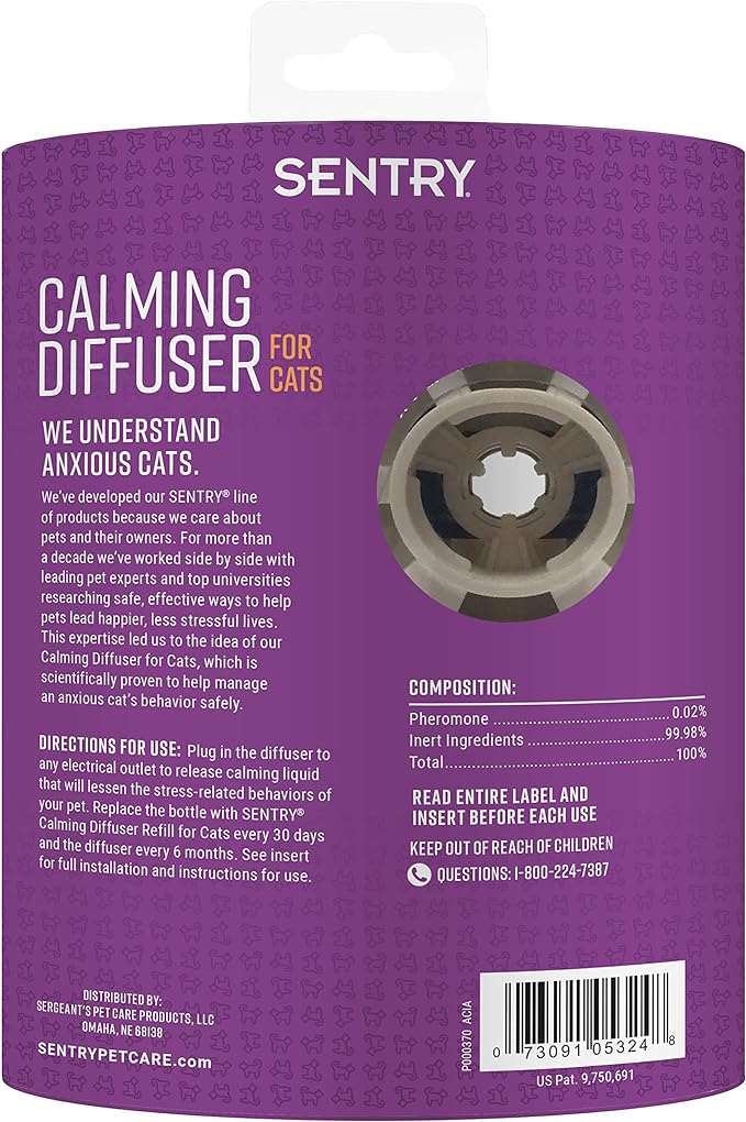 • 30-DAY RELEASE: SENTRY Calming Diffuser for Cats and Kittens is a long-lasting diffuser that releases a pheromone for up to 30 days.