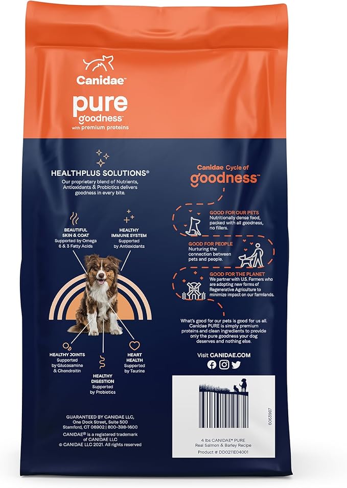 • Contains 1- 4 Lb. Bag of Canidae PURE Salmon and Barley Recipe Dry Dog Food