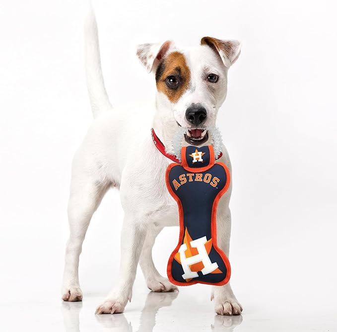 MLB Houston Astros Bone Shaped Dental Dog TUG Toy with Squeaker. Tough PET Toy for Healthy Fun, Teething, and Cleaning pet's Teeth and Gum.