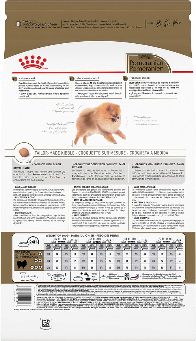 • Royal Canin Pomeranian Adult dry dog food is designed to meet the nutritional needs of pure breed adult Pomeranians