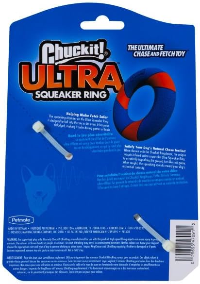 • Ultra Squeaker Ring Toy: This squeaker ring dog toy has a unique topspin action that causes it to erratically bounce, zigzag, and hop on the ground when thrown; The squeaking sound rewards your dog's curiosity