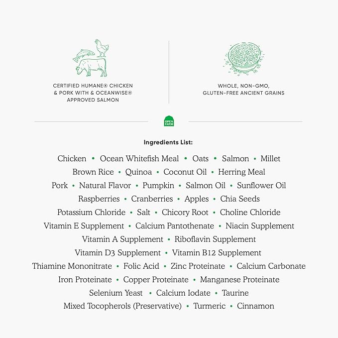 • TOP-QUALITY HEALTH AND TASTE: Open Farm's Ancient Grain Dry Dog Food formula is loaded with meaty animal protein, whole ancient grains, and fresh locally sourced produce without antibiotics, GMOs, artificial flavors, colors, or preservatives.