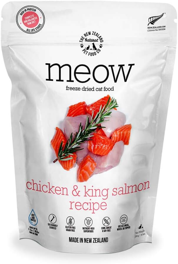 Meow Chicken & King Salmon Freeze Dried Raw Cat Food, Mixer, or Topper, or Treat - High Protein, Natural, Limited Ingredient Recipe 9.9 oz