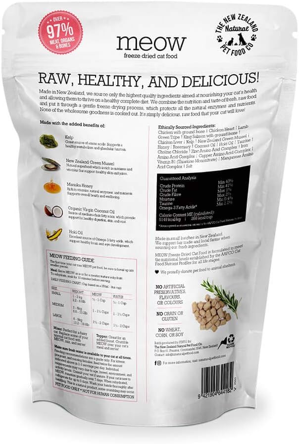 • SATISFACTION GUARANTEED: Our food is healthy and delicious and made to suit even the pickiest of eaters. If your pet doesn't love MEOW we will happily refund your purchase.