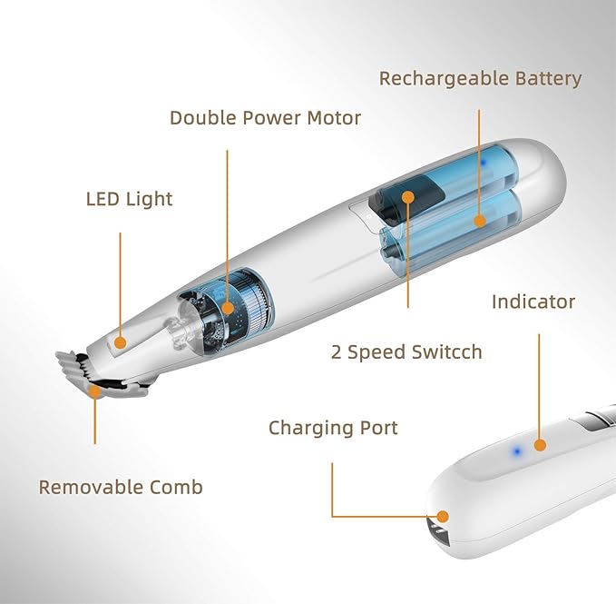 • Super Low Noise & Vibration-- Many pets get stressed by the sound and vibration of hair trimmers. However, our electric pet claw hair shaver uses a superior motor with whisper-quiet technology that produces a very low vibration to keep pets calm and help trim hair faster and easier.