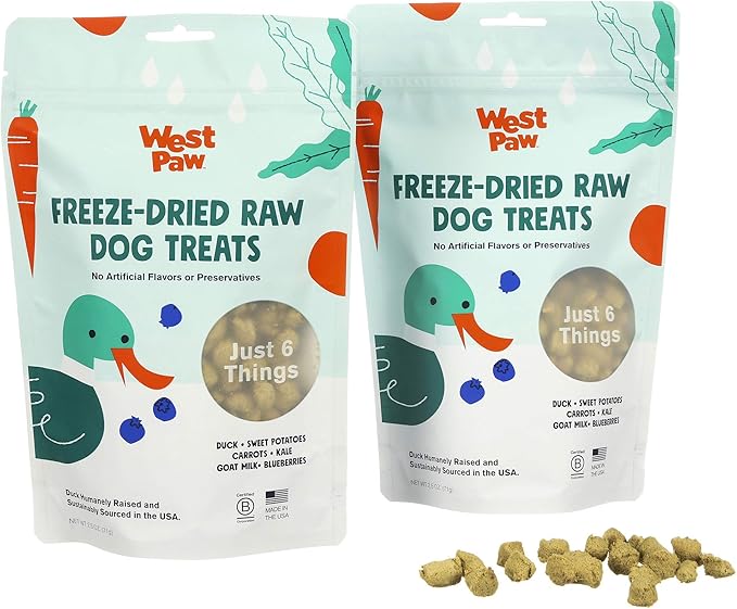 • HEALTHY, ALL-NATURAL DOG TREATS: Keep your small puppy or senior dog healthy and satisfied with these West Paw All-Natural Raw Freeze-Dried Dog Treats that are crafted with humanly-raised and sustainably-sourced fresh ingredients such as duck, goat milk and blueberries.