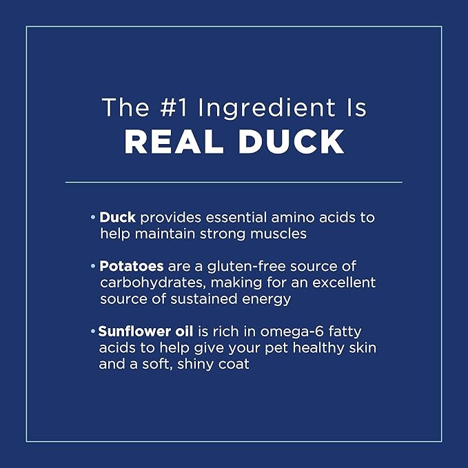 • DUCK IS THE SINGLE ANIMAL PROTEIN SOURCE providing essential protein and amino acids to help maintain strong muscles; Potato is included as a grain-free source of fiber to help support digestive health; Contains (1) 24-Ounce Bag