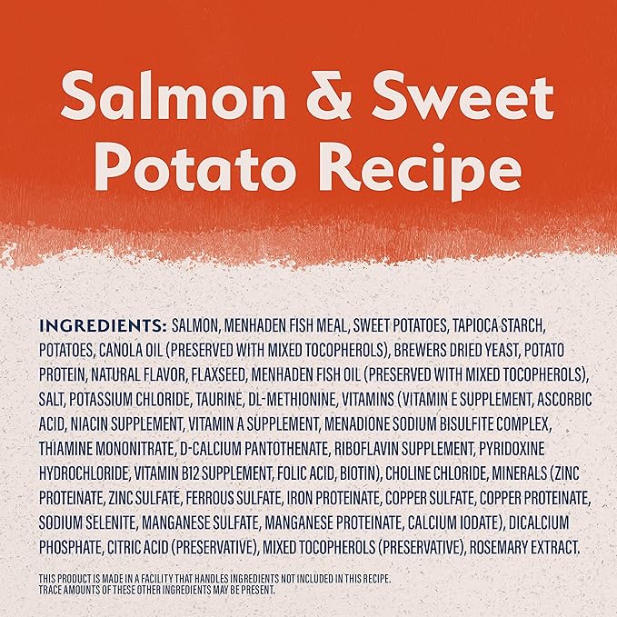 • SALMON IS THE FIRST ANIMAL PROTEIN SOURCE providing essential protein and amino acids to help maintain strong muscles; Sweet Potatoes are included as a grain-free source of fiber to help support digestive health; Contains (1) 4-Pound Bag