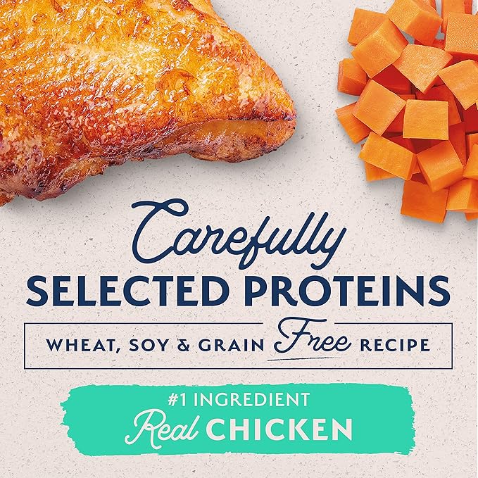 • CHICKEN IS THE SINGLE ANIMAL PROTEIN SOURCE providing essential protein and amino acids to help maintain strong muscles; Sweet potatoes are included as a grain-free source of fiber to help support digestive health; Contains (1) 24-Pound Bag