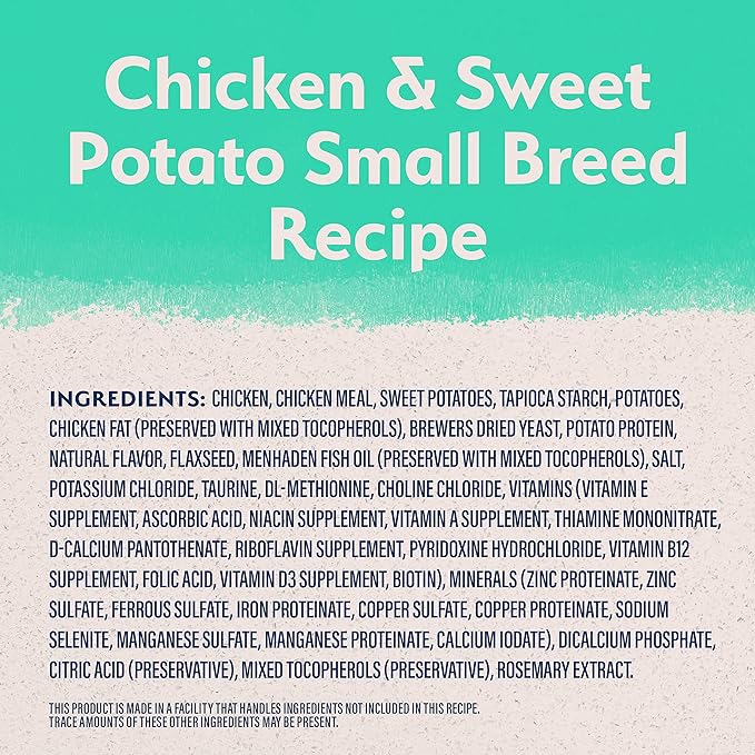 • CHICKEN IS THE SINGLE ANIMAL PROTEIN SOURCE providing essential protein and amino acids to help maintain strong muscles; Sweet potatoes are included as a grain-free source of fiber to help support digestive health; Contains (1) 12-Pound Bag