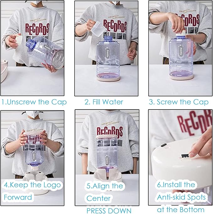 • 【Easy to clean and Use】Wide-mouthed sink base, the integrally formed water bottles can be separated, and when you clean them, you can disassemble them and rinse them directly with a faucet. We recommend cleaning the water dispenser once a week.When you use it, just fill the bottle with water and screw on the cap; Align the buckle of the water bottle with the groove on the base, keeping the logo forward; Then press the bottle is okay.