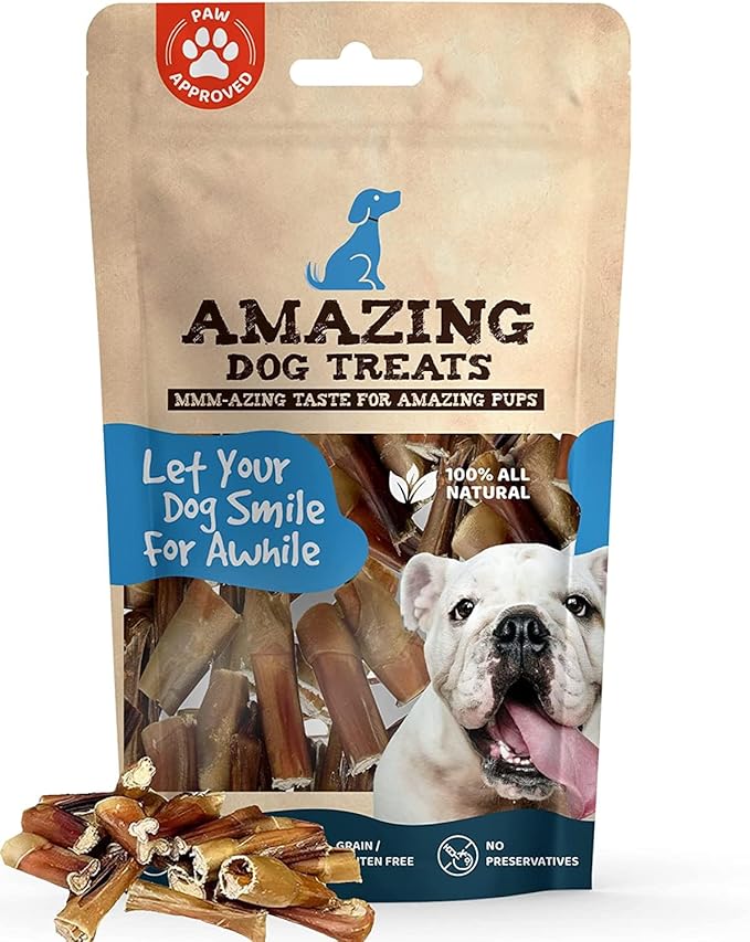 • HIGH IN PROTEIN: Bully Sticks are high in protein, and low in fat content. Amazing Dog Treats offers multiple different size bully stick alternatives for you and your pup. Thinner sticks for the more sensitive chewers, and thicker sticks for the larger breeds. We even have bully stick bubble bites for those looking for a short-term reward chew.