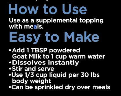 • DON’T PAY FOR DILUTED GOAT MILK – Just Add Water to Our Powdered Goat Milk to Create a Nutrient Rich Liquid Milk. Use as a Liquid Treat, to Moisten Food or, Sprinkle Over Food as a Dry Meal Topper. From our Kitchen to yours, Nature’s Diet Whole Cream Goat Milk is as easy to make as it is delicious.