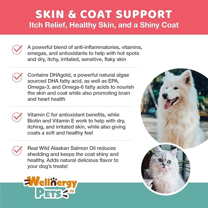 • RICH IN WILD ALASKAN SALMON OIL, OMEGAS 3, 6, AND 9, DHA, EPA, & ALGAE - Wellnergy Pets Skin and Coat Care chews relieve your dog of irritating skin & coat problems, promote hair growth, while also maintaining heart, joint, and brain health as well, using powerful all-natural ingredients
