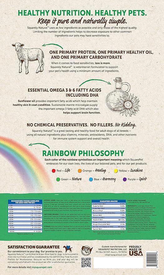 • Made with ONE PROTEIN (New Zealand Pasture Raise Lamb), ONE CARBOHYDRATE (USA Grown non-GMO Rice), & ONE HEALTHY OIL (Cold Pressed Sunflower Oil) Squarely Natural uses as few ingredients as possible and only those of the highest quality. Limiting the number of ingredients helps to decrease exposure to other common ingredients that may cause food sensitivities.