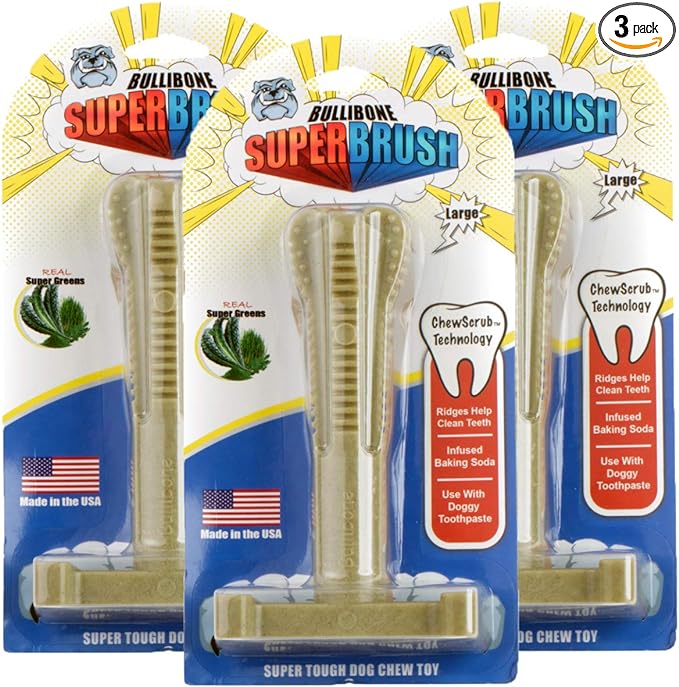Bullibone SuperBrush: Dog Teeth Cleaning Brushing Toothbrush Stick - Long Lasting Nylon Super Greens Chew Toy for Oral Care and Dental Health