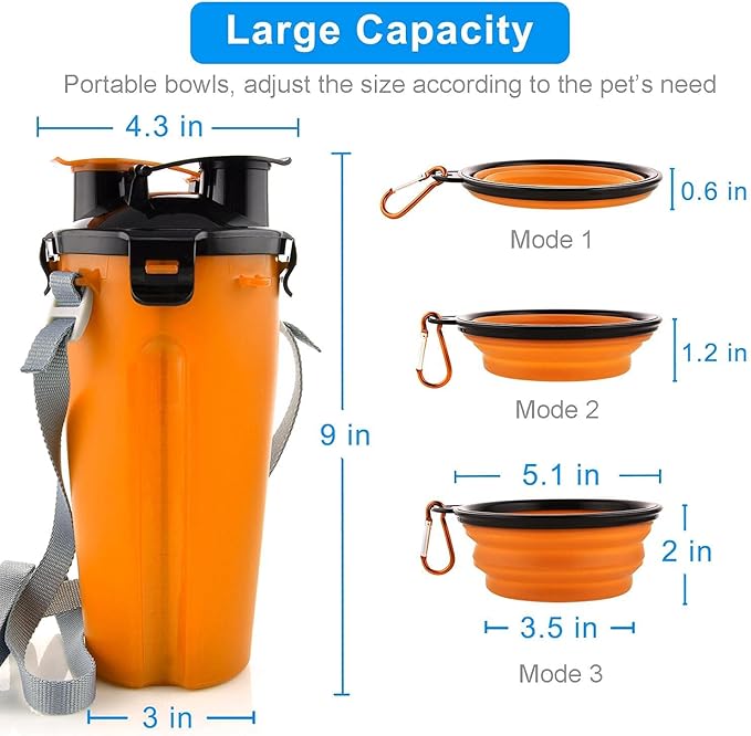 • 5.It can storage about 250g/8oz food and 350g/12oz water in on bottle, and the collapsible bowl is about 12 oz, the large capacity should be enough for stay out for a long time.