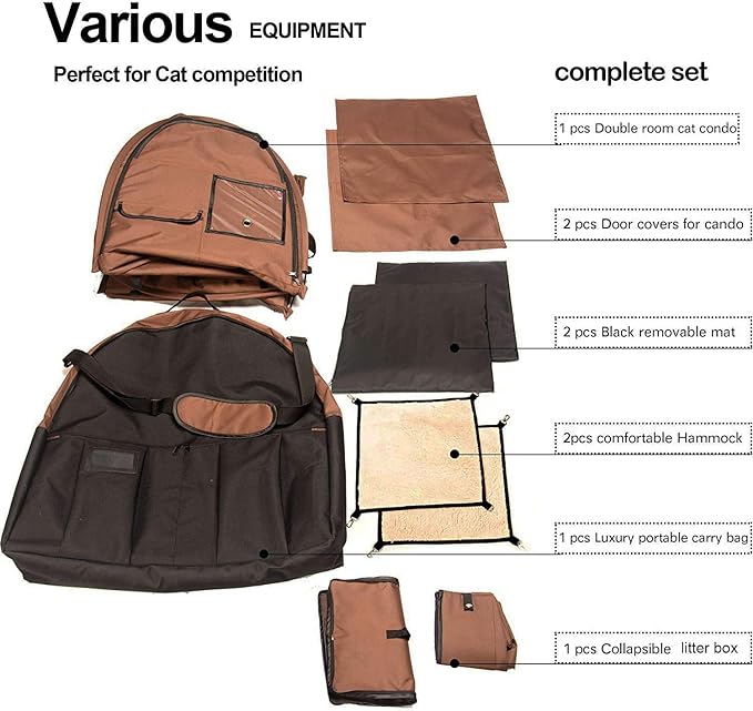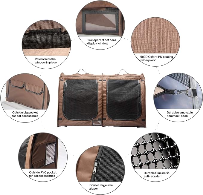 • ✔️NICE COMFORT - The oversized two-compartment structure provides a spacious and comfortable space for your kitten. Inside the cage, the structure is divided into two symmetrical parts, including a zippered Oxford cloth door separating the two sides. Above each part is a detachable fine and comfortable flannelette hammock, and below is the same flannelette mat. Your cat can rest and play in this happy nest, and we also have a foldable litter box, which is as complete as an apartment.