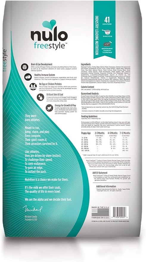 • UNBEATABLE NUTRITION - GanedenBC30 Probiotic supports healthy gut flora to aid digestion and also enhances metabolism and immune response. Nulo Freestyle Puppy dog food also includes DHA to help your puppies cognitive development. DHA-supplemented kibble may reduce destructive behaviors and help your pet adjust better to new homes.