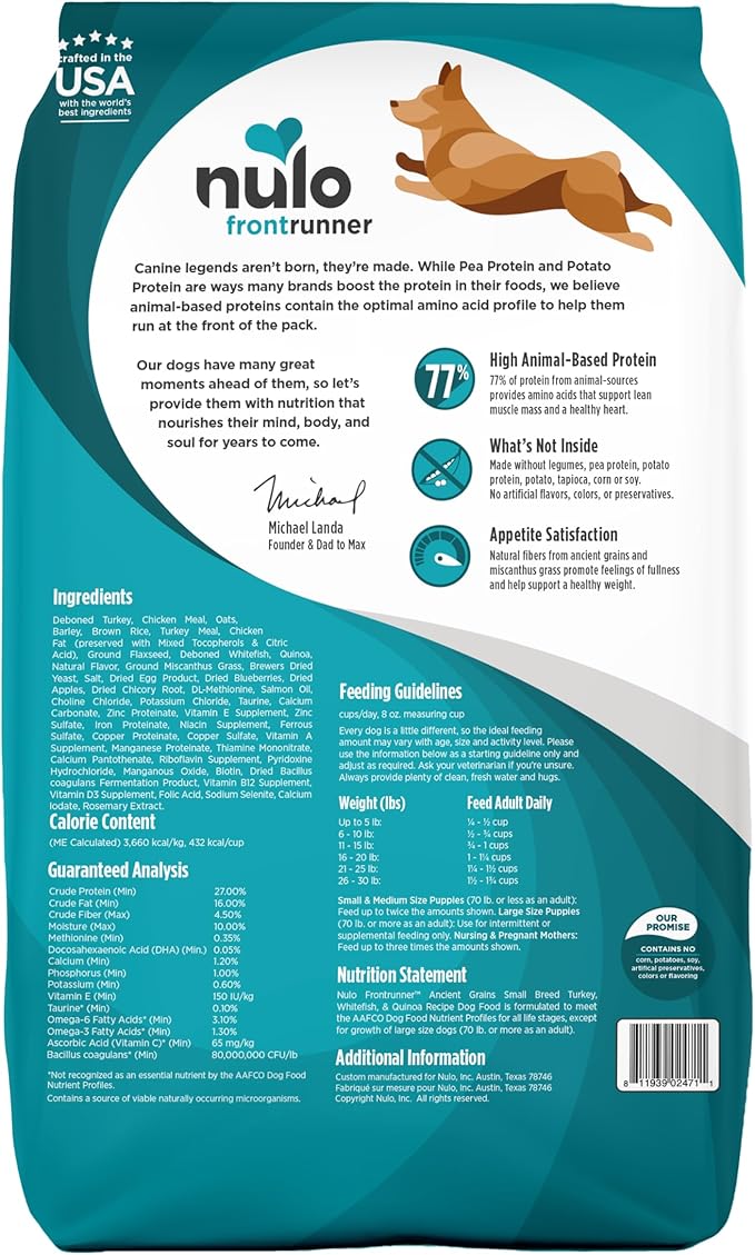 • THE FRONT OF THE PACK - Canine legends aren't born - they're made; Ensure your dog has the nutrition they need with the Nulo Frontrunner Small Breed Dog Food; which features a formula of 77% animal-based protein and healthy ancient grains.
