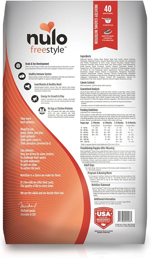 • UNBEATABLE NUTRITION - GanedenBC30 Probiotic supports healthy gut flora to aid digestion and also enhances metabolism and immune response. Nulo Freestyle Puppy dog food also includes DHA to help your puppies cognitive development. DHA-supplemented kibble may reduce destructive behaviors and help your pet adjust better to new homes