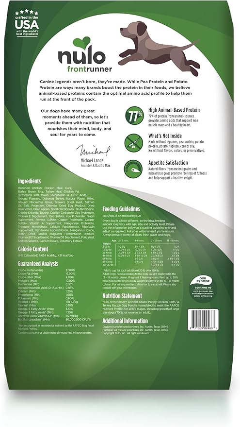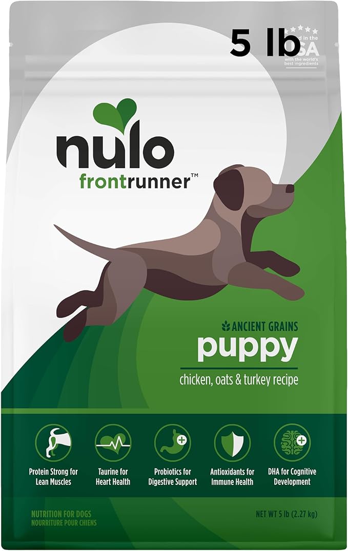 • CHICKEN, OATS, & TURKEY RECIPE - Start your puppy’s legend with all the nutrition they need with the Nulo Frontrunner Puppy Dog Food with Chicken, Oats & Turkey. 5 lb bag.