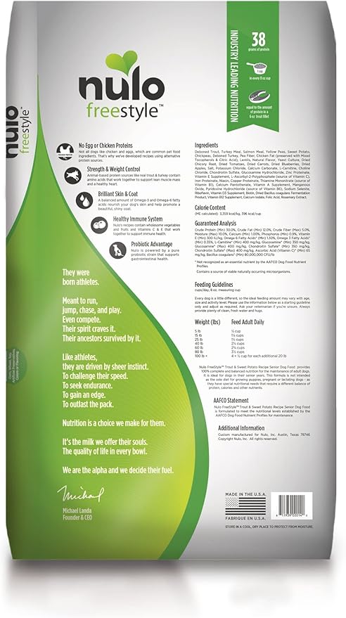 • TROUT & SWEET POTATO RECIPE - Nulo Freestyle All Breed Senior Dog Food takes care of your senior pet with BC30 Probiotic and Chondroitin Sulfate for leading hip & joint support in their kibble. 6 lb bag.