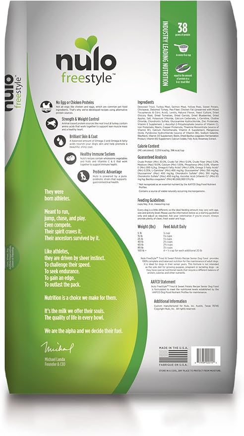 • TROUT & SWEET POTATO RECIPE - Nulo Freestyle All Breed Senior Dog Food takes care of your senior pet with BC30 Probiotic and Chondroitin Sulfate for leading hip & joint support in their kibble; 26 LB bag