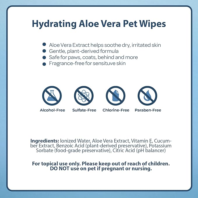 • Hydrating Plant-Based Formula – Infused with Aloe Vera, Vitamin E, and cucumber extract our small pet grooming wipes nourish and hydrate your fur-baby’s skin. They’re also 100% free from sulfates, parabens, alcohol, or harmful chlorines.