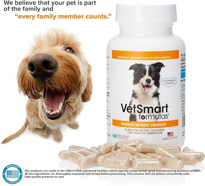 • GUARANTEED RESULTS - Our proprietary formula is designed by Vets and for Vet offices and is the best dog probiotic on the market today. There are NO artificial flavors, colors, or fillers. This product is wheat-free and safe for dogs with allergies. VetSmart Formula products are 100% MADE IN THE USA to the highest quality standards.