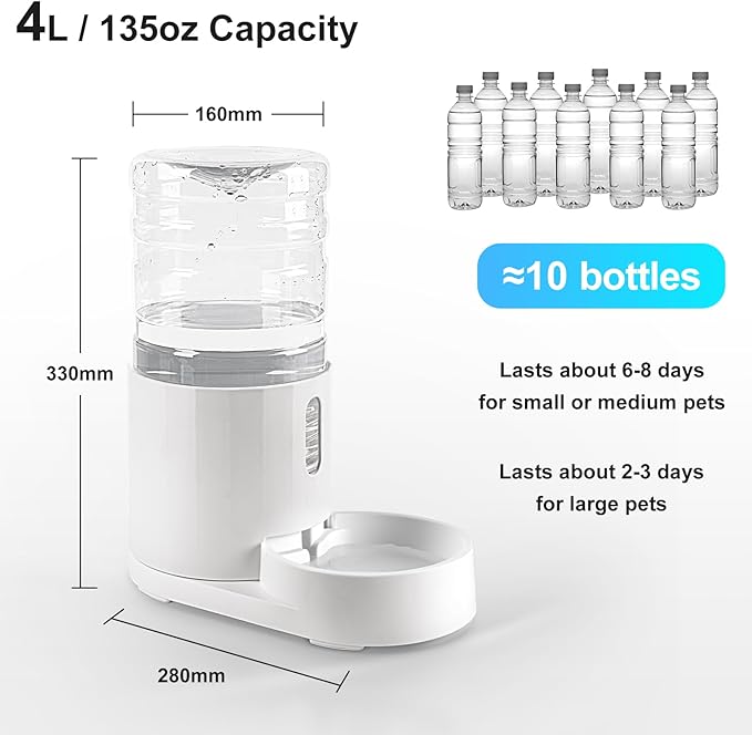 • Large capacity - 4L capacity, equals about 7 bottled water, lasts 5-10 days for small/medium pets, 2-5 days for large pets. Sufficient water when your pets are at home alone. Then you can go out carelessly.