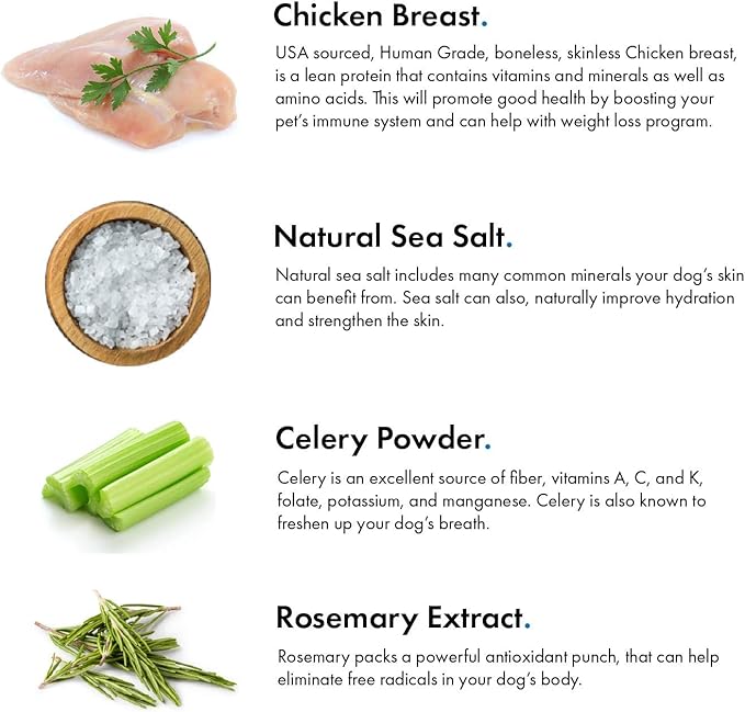 • SIMPLE RECIPE: Our Chicken Jerky is simply made to simply be better. We slice whole muscle chicken breast from USA farms. Each piece is slow cooked in our ovens to bring out flavors and chewy texture that even the pickiest dogs will love. You’ll smell the difference the second you open the bag.