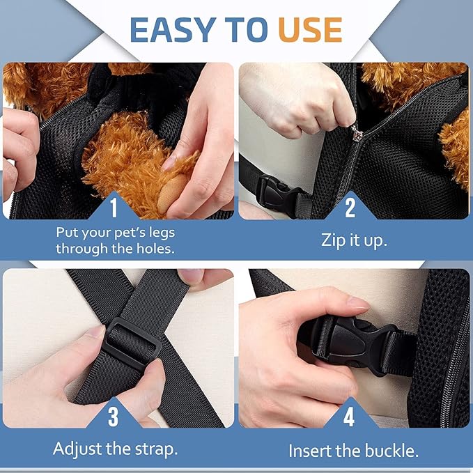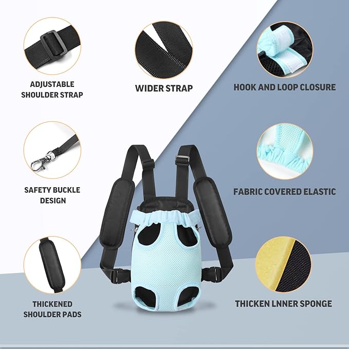 • Safe and Fashionable Design: The breathable mesh material provides your dog with warmth in winter and keeps them cool in summer. Adjustable wide straps with an elastic neck design in the dog front backpack carrier offer ample flexibility and comfort. A built-in safety lock ensures your pets stay secure and prevent them from flopping.