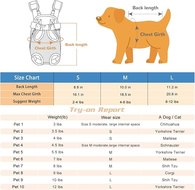 • 3 Sizes Available for Your Beloved Pet: The suggested weight for the dog front backpack is for reference only. If your dog's body length requires size S but the girth requires size M, please choose size M. Additionally, leave at least an extra inch to ensure your pet's comfort.