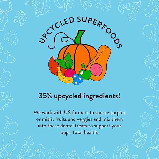 • Upcycled With Care: We work with farmers to rescue their imperfect fruits and vegetables that have all the same healthy nutrients. This means every bag of our treats decreases food waste while saving valuable resources.