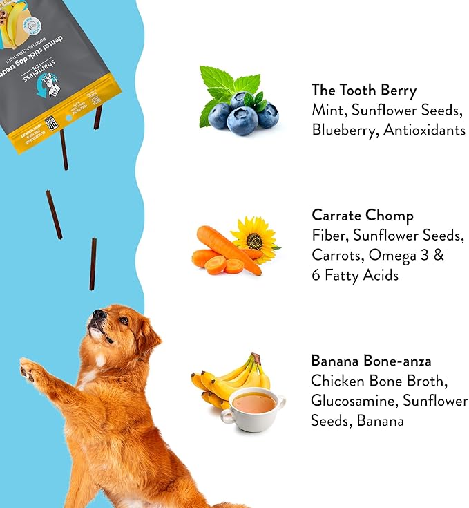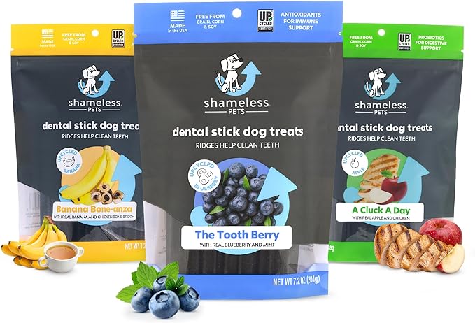 • Doggy Dental Treats: Help keep your pup’s pearly whites clean and their breath fresh with this Shameless Pets Dental Stick Variety Pack. We made our dental treats with ridges in order to deep clean teeth, and we’ve add key upcycled ingredients to support your pup’s total health. Includes three bags with 8 sticks each in the flavors The Tooth Berry, Carrate Chomp, and Banana Bone-anza.