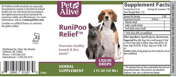 • Herbal supplement supports healthy, firm stool formation in cats and dogs