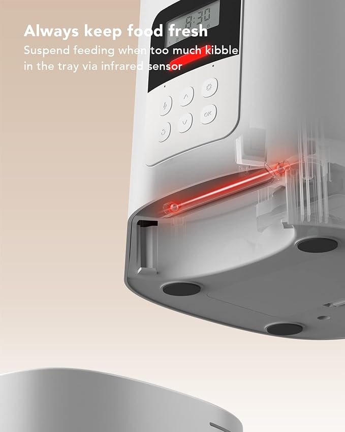 • Easy-to-Read LCD Panel: Program the feeding on the LCD panel with detailed instructions; Clear LED indication let you know every status of the auto cat feeder, the built-in infrared sensor can easily tell you the situation of insufficient food or stuck