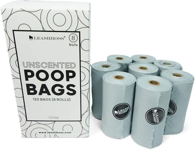 Leashboss Dog Poop Bags - 120 Bags, 8 Rolls Unscented Leak Proof Waste Bag Rolls (Gray, 8 Rolls)