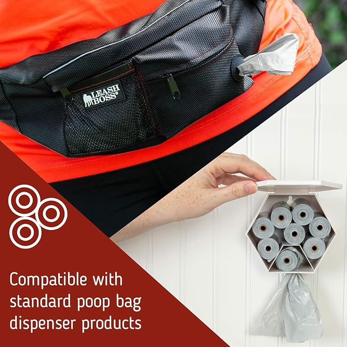 • 120 bags per box - Each box includes 8 standard-size rolls of poop bags. Each roll includes 15 bags. Bags are compatible with your favorite dispenser including the Leashboss Wall-Mounted Poop Bag Dispenser, KibbleGo bag, and PackUp Pouch fanny pack (all sold separately).