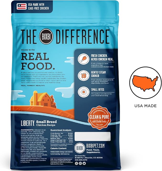• MADE WITH FRESH CHICKEN, NO MEAT MEAL: BIXBI LIBERTY dog food starts with fresh chicken and adds whole ingredients, never cheap fillers—no chicken meal and no meat meal—and comes in small bites for your small dog