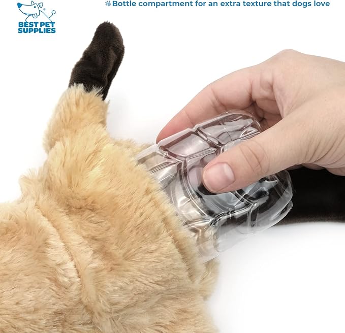 • Minimize Mess: With a squeaker in the head and another in the tail, this stuffing-free dog toy makes every bite a delightfully squeaky treat. These squeaky dog toys also have self-fastener at the bottom that you can open up and place a plastic bottle in to introduce a fun crunch into the mix. No bottle insert space for the small size.