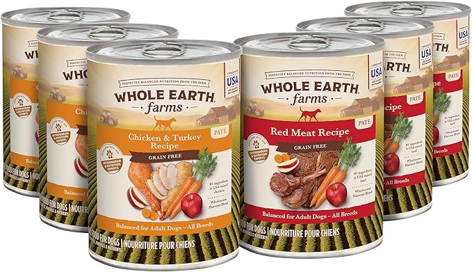 • Whole Earth Farms Pate Dog Food Cans, Grain Free Wet Dog Food Variety Pack, Chicken and Turkey, Red Meat