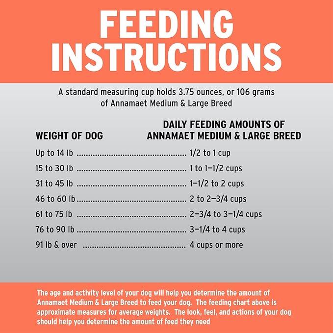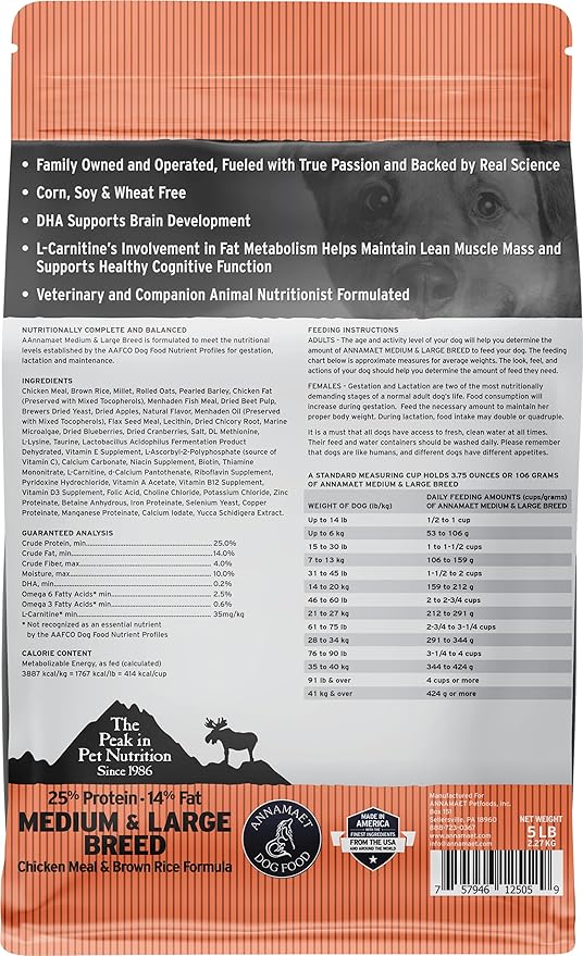 • Annamaet Medium and Large Breed is designed for active dogs and also meets the needs of puppies including large breed puppies, This formula is made with antibiotic free, low ash chicken, fish and brown rice