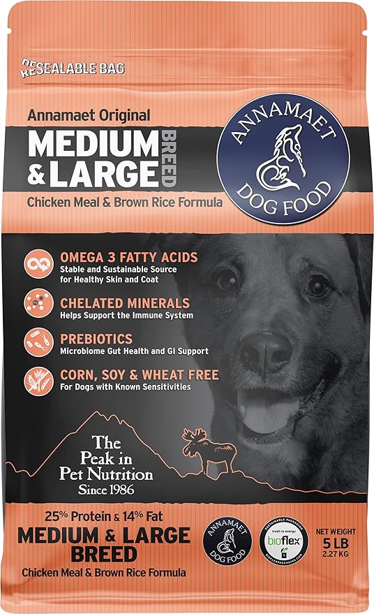 Annamaet Original Medium and Large Breed Formula Dry Dog Food, 25% Protein (Chicken & Brown Rice) - 5 lb. Bag