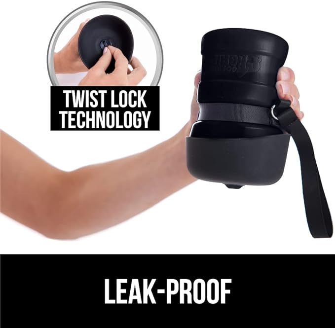 • LEAKPROOF DESIGN: pet water bottle is designed with an easy twist lock mechanism located at the bottom of the silicone bowl; twist the lock to create an air tight seal that helps prevent water from leaking out of the bottle