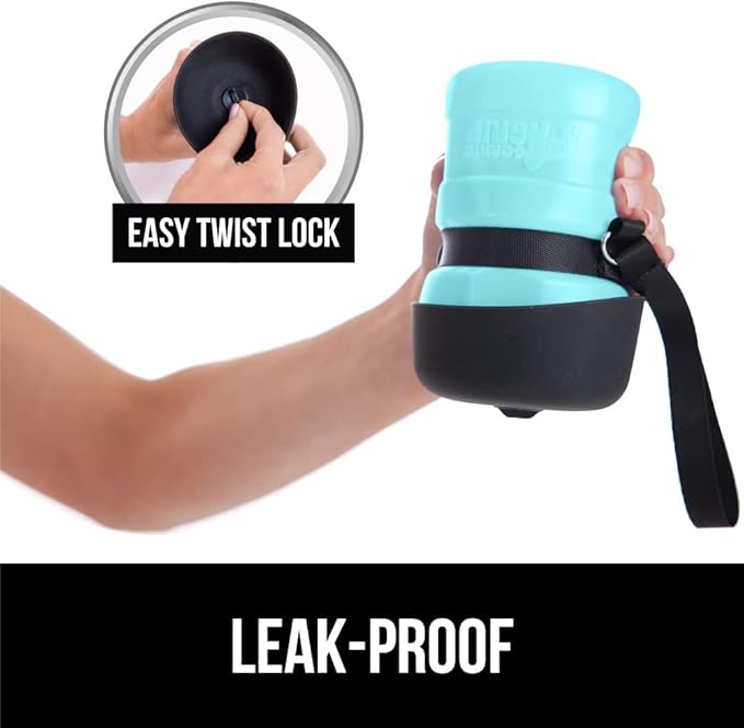 • LEAKPROOF DESIGN: pet water bottle is designed with an easy twist lock mechanism located at the bottom of the silicone bowl; twist the lock to create an air tight seal that helps prevent water from leaking out of the bottle