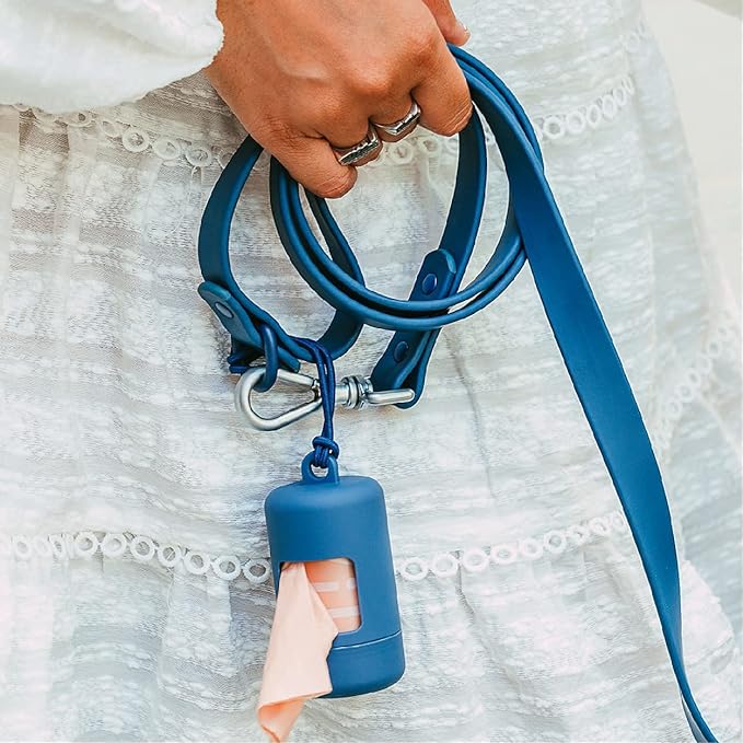 Wild One Dog Poop Bag Holder and Dispenser with Leash Attachment, Leak Proof, Easy Twist Top for Refills, Includes 1 Roll Poop Bags, Blue